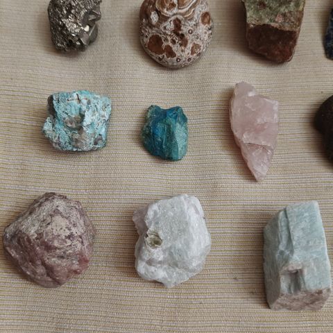 kiviä, takana ruusukvartsi ja kirkas kvartsi. edessä Amazonista tilattuja kivitähtiä.