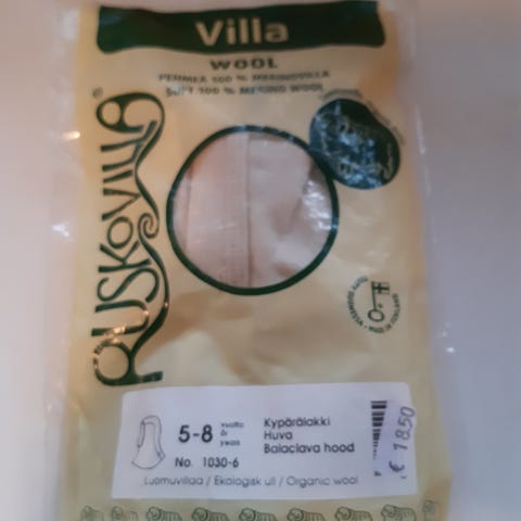 Ruskovillan luonnonvalkoinen villainen kypärähuppu, paksua kaksinkertaista villaa. Ei kokolappua mutta tullut meille kokotiedoin 5-10 v. Siisti ja hajusteeton, 4 pientä paikattavissa olevaa a 0,5 cm ja alle reiänalkua, kukin vain päällimmäisessä kankaassa. 2 ulkopuolella takana, 2 edessä sisäkankaassa. Näistä kuvat.