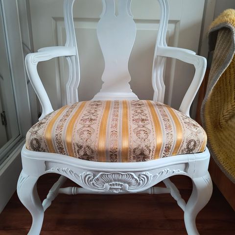 Jämäkkä nojatuoli, ehjä runko. Verhoilu vaatii korjausta. Jousitus ehjä.