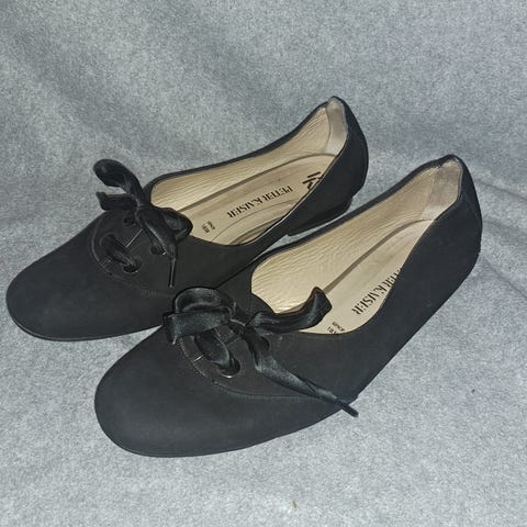Käytetyt, hyvä kuntoiset ballerinat. Roiskejälkiä kenkien pinnalla ja likaa pohjissa. Lian saa puhtaaksi putsaamalla. Myös kengän pohjissa olevat tekstit kuluneet hieman. Arvioitu alkuperäishinta noin 150-200€.