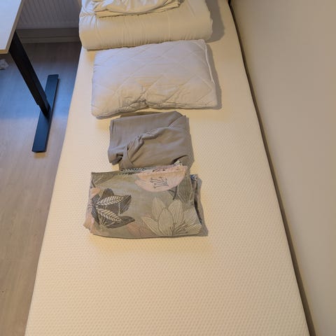 Kuvassa näkyy myös sinivalkoinen Ikean Vesteröy joustinpatja, joka voidaan myydä erikseen (hinta 50 eur) tai yhdessä sänkyrungon kanssa (hinta 190 eur). Patjasta tiedot löytyy IKEAn sivuilta.