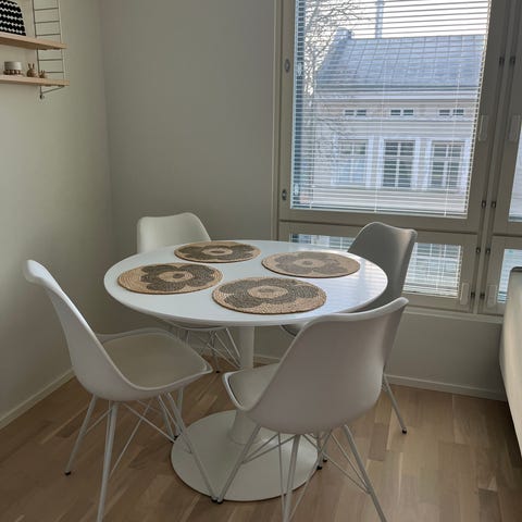 Myydään keittiönpöytä ja 4 tuolia. Pöydän halkaisija n 80cm.
