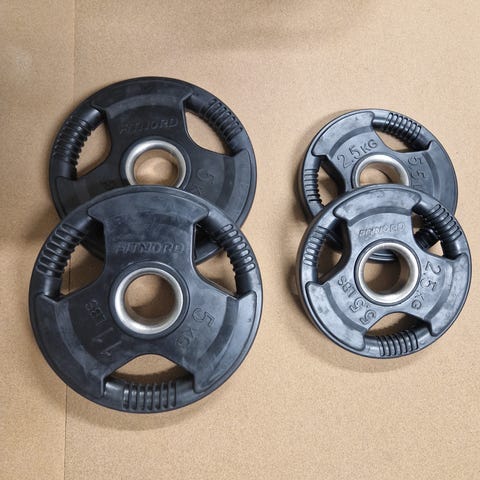 Levypainot 50mm keskireikä kumitetty tri-grip. 2 x 5kg, 2 x 2,5kg, 2 x 1,25kg.