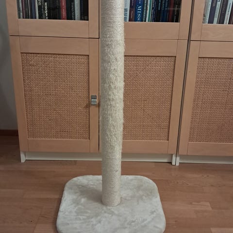 Itsetehty kissan raapimapuu, jossa on puinen runko ja raapimisalue kiedottuna köydellä. Jalusta betonia. Painaa noin 30 kiloa eli autolla nouto on kannatavaa. 😁