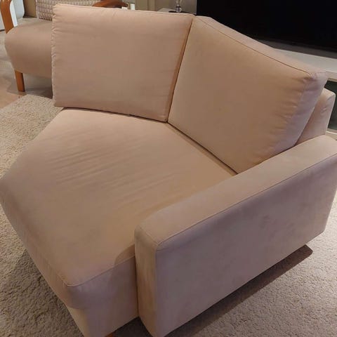 Vasemman puolen selkänoja ja käsinoja kulahtaneet. (Pinta rikki keinonahasta)
