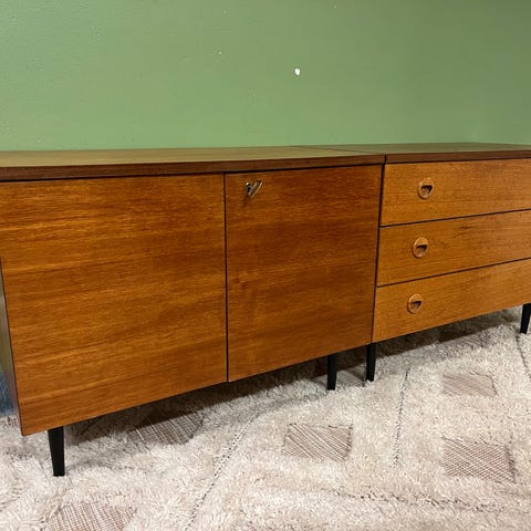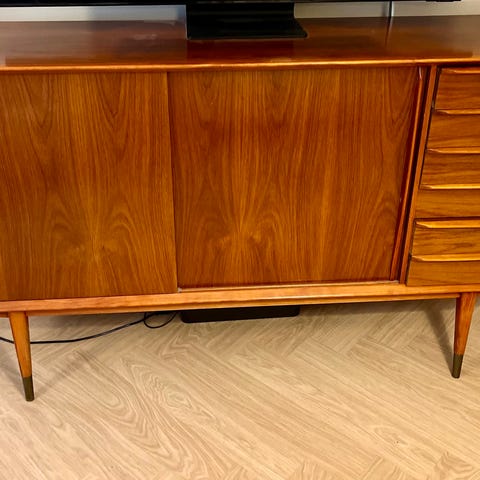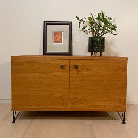 Tiikki senkki pinnijaloilla tai pieni kaappi liukuovilla. 50 tai 60-luvulta.