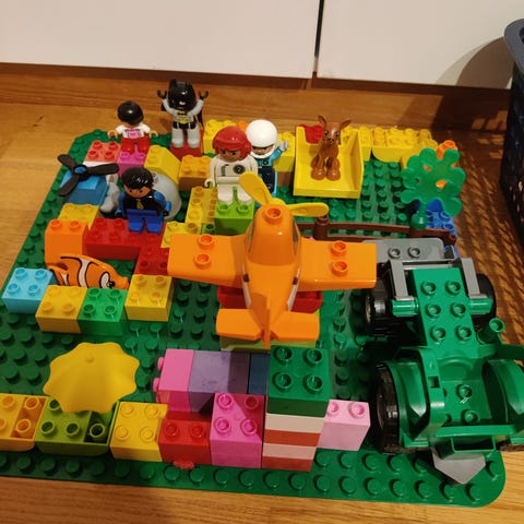 Duplo setti. Paljon erilaisia duplo-palikoita: moduulileikkimökki, poliisilaitos, kaupunkihöyryjuna. Valitettavasti ilman ohjetta. Joroinen, Varkaus.