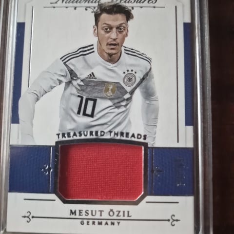 Panini National Treasures Andres Iniesta jalkapallokortti, jossa on osa pelipaidasta. Kortti sisältää Espanjan jalkapallomaajoukkueen pelaajan Andres Iniestan kuvan ja pelipaidan palan.Messi,Ronaldo,Topps