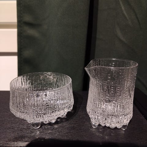 Ultima thule kermakko korkeus 8cm, halkaisija 5.5 ja sokeri halkaisija 8cm. Ehjät on