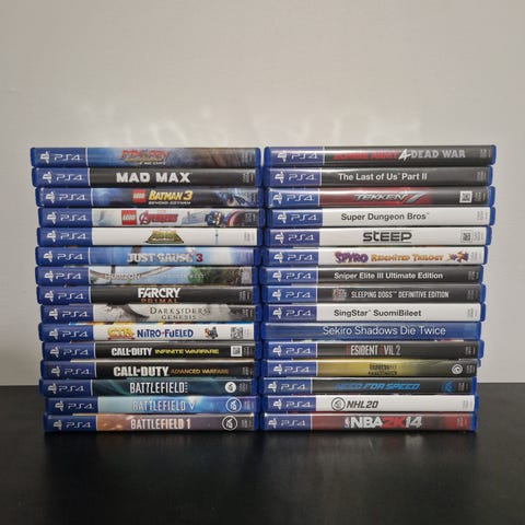 Playstation 4 pelit sisältäen Far Cry 6, Doom Eternal, The Last of Us Part II ja Doom. Pelit ovat fyysisiä kopioita Playstation 4 -konsolille.