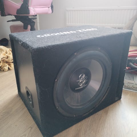 Ground Zero GZIW 12XSPL-D2 12 tuuman subwoofer, teho 1000 wattia, impedanssi 2 x 2 ohmia, pink edition. Sen mukaan tulee GZIA 1.1150D vahvistin jonka mukaan tuli bassonsäädin. Ostin itse motonetilta noin vuosi sitten. Elementti on laitettu spl dynamics koteloon.