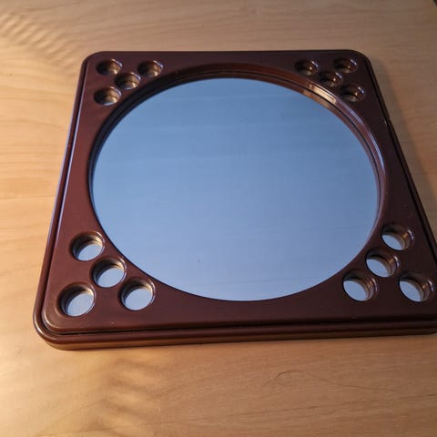 Kuvan mukainen pyöreä peili Mäkisen Kuvastin/Finmirror mallinumero 296. Halkaisija 40cm. Ilmeisesti itse joskus maalattu kultaiseksi. Takapuoli kastunut joskus mutta peilissä ei ole mitään hajuja tms.. Ollut itsellä käytössä noin 10 vuotta. Peili itsessään 1960-luvulta.