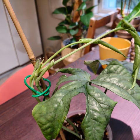 Amppelissa kasvava cebu blue. Viimeisessä kuvassa näkyy seinällä kasvava emokasvi. Emokasvi tekee reikälehteä, tämä amppeli ei. Jos haluaa reikälehteä, vaatii tukea kasvaakseen ylöspäin.