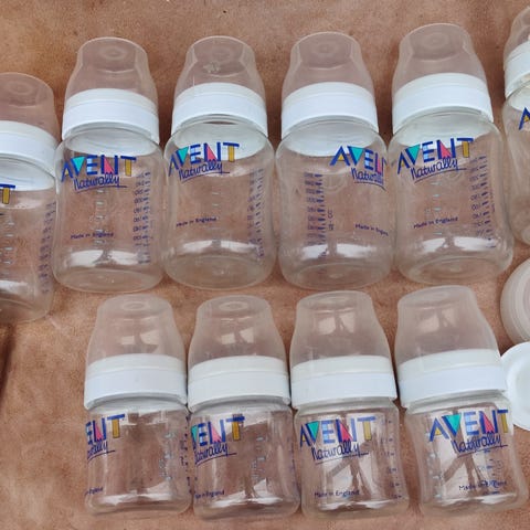 Aventin tuttipulloja. Käytettyjä, mutta hyväkuntoisia. Osa tuttiosista vähän käytettyjä ja ainakin yksi käyttämätön. Tuttiosat ovat kokoa 3-5.