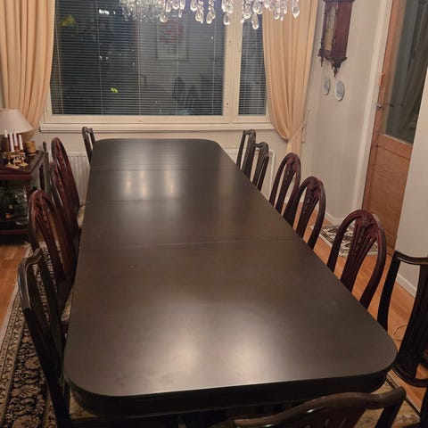 Pari vuotta sitten maskusta ostettu ruokailuryhmä kuudelle hengelle. Yleisesti siisti ja hyvin pidetty, mutta tuoleissa istumapaikkaa nahkaa ja yhteen tuoliin jäänyt housuista väriä (ehkä saa jollain pois, en ole koittanut). Muut siistejä ja pöydässä kuvan mukainen pikku pikku jälki joka ei kauheasti edes näy.