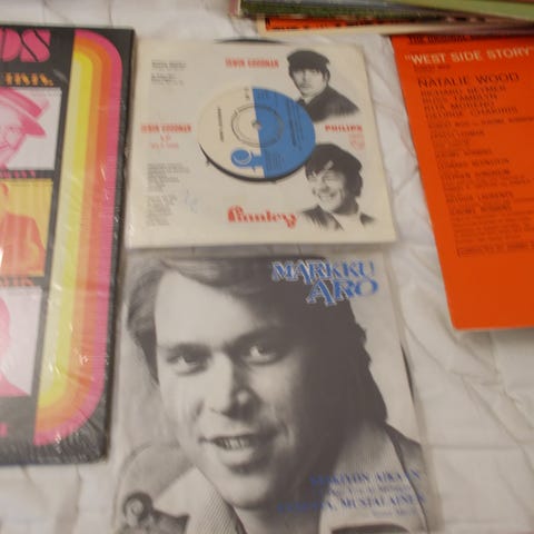 Kaksi vanhaa säilytystelinettä vinyyleille, toinen sopinee myös lehtien säilytykseen.