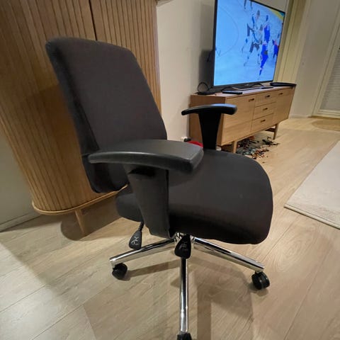 Elämää nähnyt pelituoli muuton yhteydessä seuraavalle. Keinonahkapinta kulunut valtaosin pois, kuten kuvasta näkee. Käsinojat ja ristiselän tyyny hukassa.