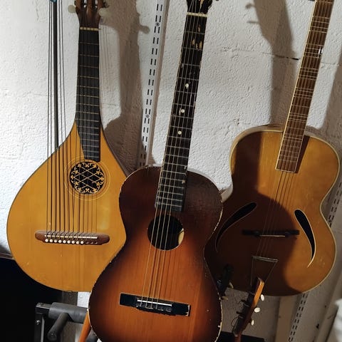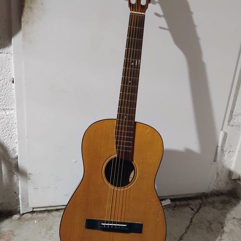 Kaunis kokopuinen kitara menneiltä vuosilta. Ei suinkaan ole säilynyt täydellisesti. Kyljessä halkeamavaurio joka kattaa n 1/4 kyljen pituudelta. Liimana oletettavasti jokin lämpöreagoiva liima, merkkiä tuntematon (erikeeper?) Korjausta hiukan päivitetty titebond hide gluella. Vaurio selkeästi havaittavissa. Ei ole sisäpuolelta tuettu millään, ei resonoi tai vaikuta sointiin mielestäni oleellisesti.