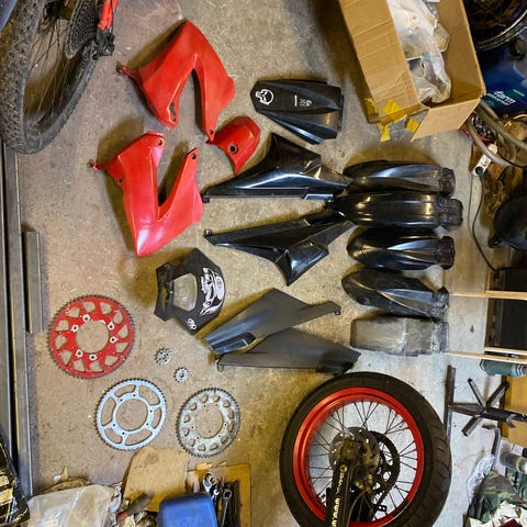 Kokoelma käytettyjä mopon rattaita.