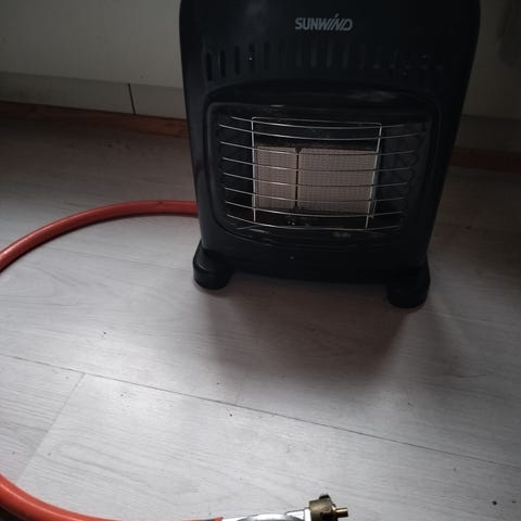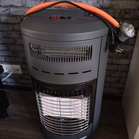 Sunwind kaasulämmitin. Lämmitin toimii nestekaasulla eli samaa mitä mm. kaasugrilleissä käytetään. Mukaan tulee letku ja paineensäädin, mutta suosittelen vaihtamaan ne kun uudet ei paljoa maksa.