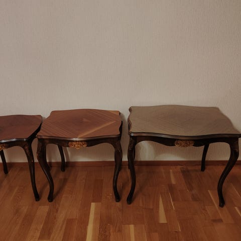 Sarjapöytä 3-osaa. Pieniä käytön jälkiä. Yleiskunto todella hyvä. Koristeelliset kaiverrukset, kaarevat jalat