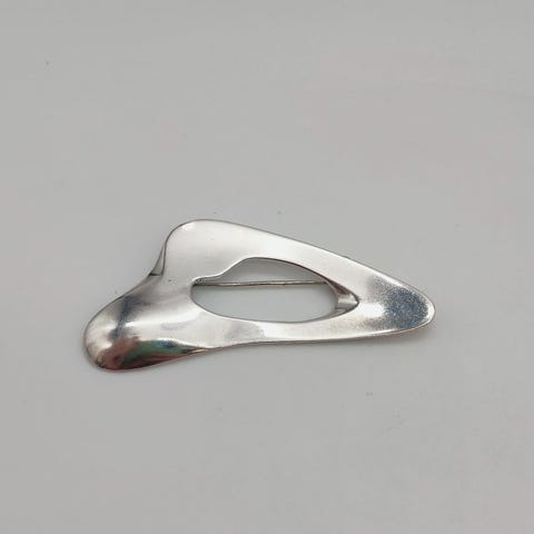 De broche on täysin hopeaa ja takapuolella on toimiva turvalukko. Yläosassa on kiinteä silmukka, jonka avulla sitä voidaan käyttää myös riipuksena.