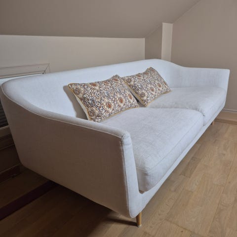 Sohvassa on havaittavissa käytön jälkiä, kuten hieman kulumaa nahkapinnassa. Jalat ovat tukevat. Alta suojakangas revennyt irti, ei vaikuta käyttöön eikä näy päälle. Yleiskunto on kuitenkin hyvä ja sohva on edelleen käyttökelpoinen.