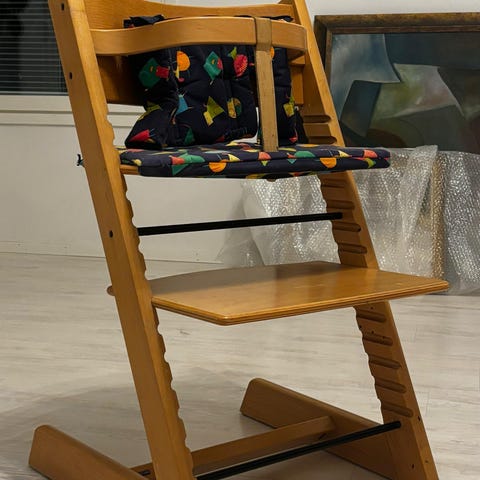 Stokke Syöttötuoli on lasten syöttötuoli, jossa on valkoinen istuinosa ja puiset jalat.