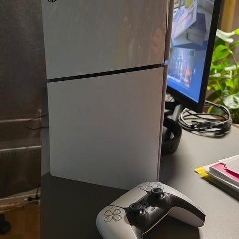 Playstation 5 pelikonsoli, sisältää konsolin, kaksi valkoista ja kaksi mustaa ohjainta ja vaaleansinisen ohjaimen, sekä lisävarusteita kuten kuulokkeet ja lataustelakan kahdelle ohjaimelle.