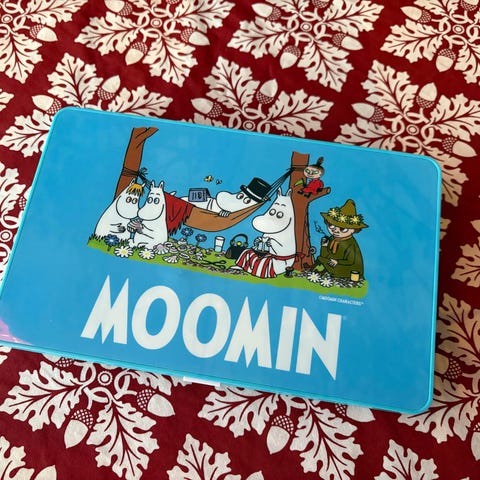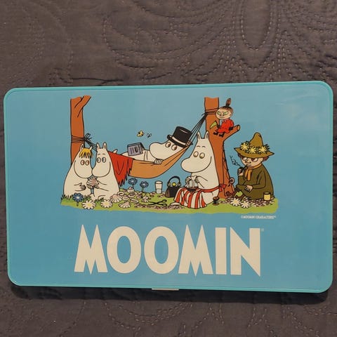 Uutena tullut ja yhdellä lapsella ollut sisäkäytössä. Yksi muumitarra vähän repsottaa.