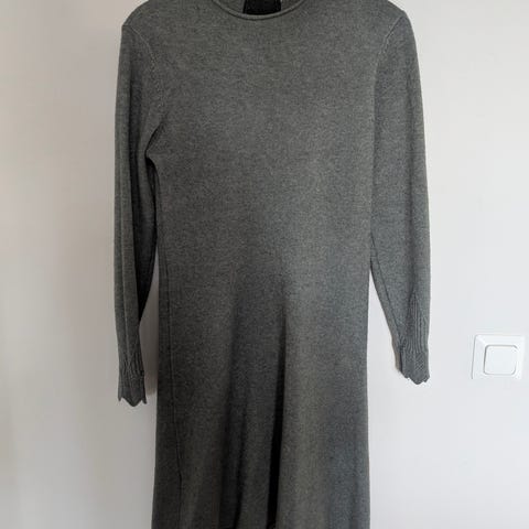 Oikein hyväkuntoinen italialainen neulemekko. Kaunis vaalea beige, oatmeal -väri. 50 % viskoosia, 27 % polyesteriä ja 23 % nailonia, mukava pehmoinen materiaali. Joustava yläosa, istuu nätisti. Olka-helma 91 cm.