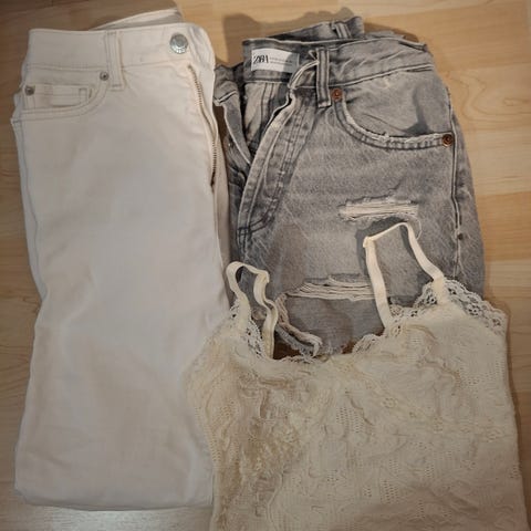Hyväkuntoinen vaatepaketti tytölle: 2 farkut ja villapaita. Koko xs/152 cm. Postitus tai kuljetus lähikuntiin.