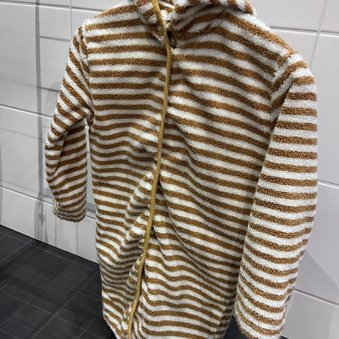 Noshin paljon pidetty froteinen kylpytakki koossa 134/140cm. Pientä kellastumaa hupussa ja takin sisäpuolella, en ole yrittänyt liottaa puhtaaksi.