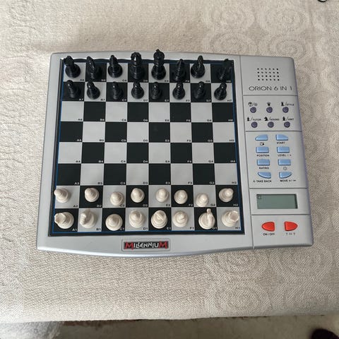 Pieni (n. 13 cm x 13 cm), matkalla ym. käyttökelpoinen mustavalkoinen shakkilauta, johon tulee kuvassa näkyvät pienet mustat ja valkoiset nappulat mukaan. Ne kiinnittyvät lautaan magneettien avulla, joten ne pysyvät paikoillaan vaikka ylösalaisin. Pelin saa hakea 9 eurolla.