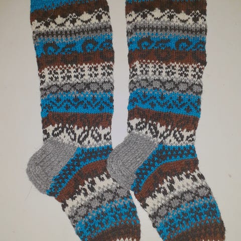 Pitkät villasukat, värit musta, ruskea, harmaa ja luonnonvalkoinen. Sukissa erilaisia eläinaiheisia kuvioita. Koko 36-37.