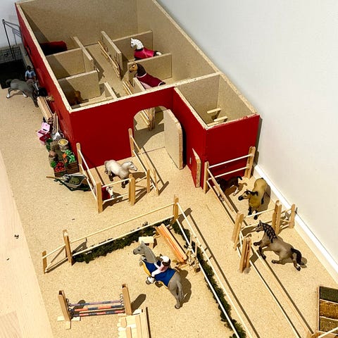 Tämä on monipuolinen lelu. Maneesi voi olla laitumena tai esim. kouluratsastus tai esteratsastus käytössä. Mukana paljon hevosen hoitoon liittyviä tarvikkeita.