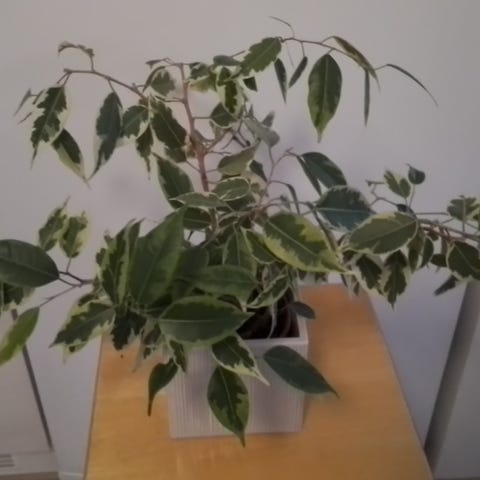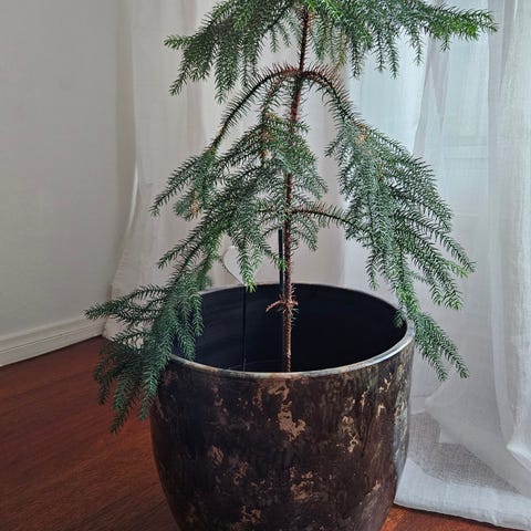 Myydään huonekuusi valkoisessa ruukussa. Ruukun halkaisija: 29cm