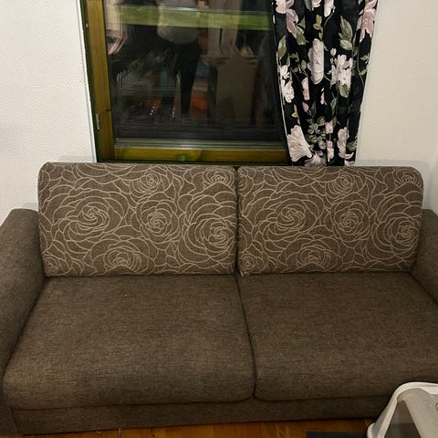 Annetaan tumman sininen vuodesohva. Tämä on jo elämää nähnyt, mutta edelleen mukava ja tukeva nukkua. Tyynyt mahtuvat kätevästi divaanin sisälle levityksen ajaksi.