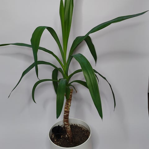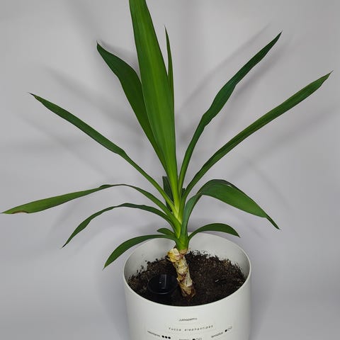 Yucca-palmu ruskeassa ruukussa. Kasvi sopii sisätiloihin ja vaatii vähäistä hoitoa.