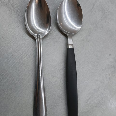 Sorsakoski 100-sarja. Lusikoiden varsien taivutukset poikkeavat hieman toisistansa (viimeinen kuva) ja osassa lusikoita lusikkapesän kärki ei ole aivan säännöllisen kaareva (kuva 1).
