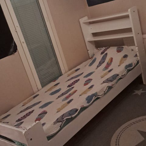 Vanhasta sivusta vedettävästä sohvasta tehty sänky. Voi palauttaa sohvaksi.