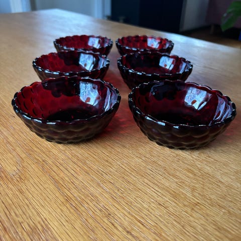 Anchor Hockingin 1950-luvulla valmistamat rubiininpunaiset lasit (Bubble Ruby Red).