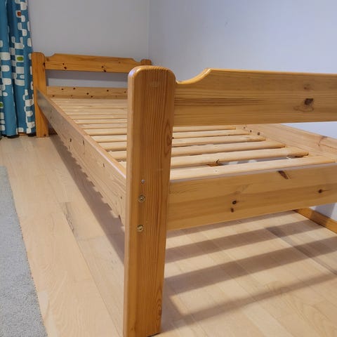 Hyvässä kunnossa oleva sänky, alla vuodelaatikko josta saa varavuoteen