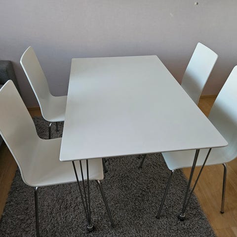 Myydään edullisesti pöytä ja 6 tuolia. Pöytä hyvässä kunnossa, tukeva.