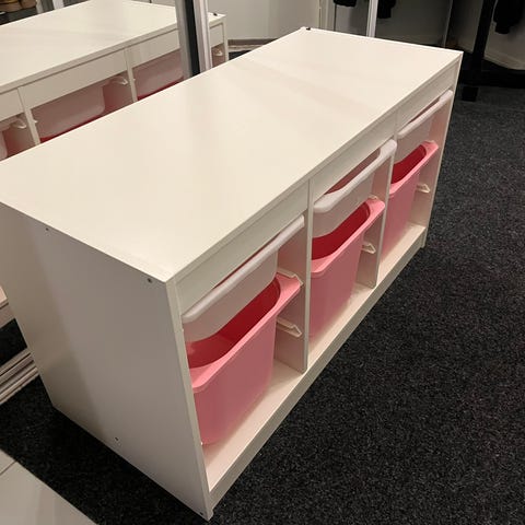 IKEA lastenhuoneen säilytyskaluste, jossa musta runko ja useita muovisia säilytyslaatikoita eri väreissä (musta, oranssi, vihreä). Siistissä kunnossa. Soveltuu lastenhuoneen tavaroiden järjestämiseen. Kuljetus saattaa olla mahdollinen omien menojen mukaan matkan varrelle.