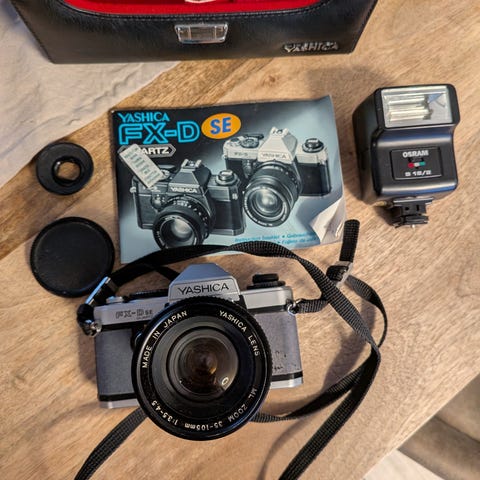Yachica FRII + tamron 35-70 objektiivi. Salama, nahkainen retro kameralaukku