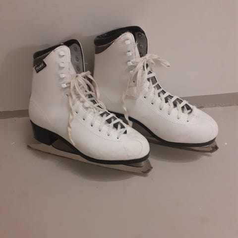 Susan luistimet, koko 38. Väri valkoinen. Hyvässä kunnossa, muutamat jäljet luistimissa, jotka näkyvät kuvissa, huomioitu hinnassa. Muuten ehjät ja hyvät.