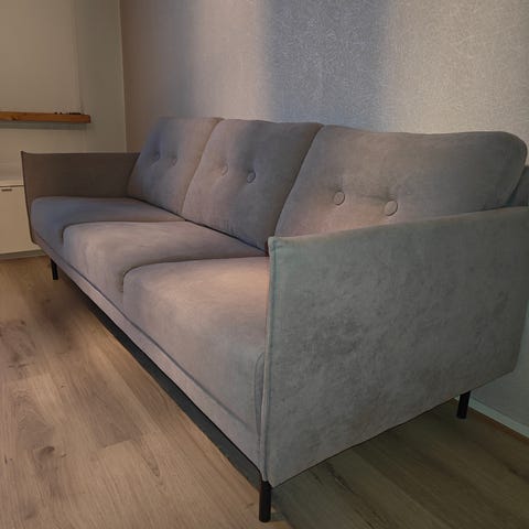 Siisti ja hyväkuntoinen harmaa sohva uuden tieltä. Irrallinen niskatuki, jonka paikkaa voi vaihtaa. Kangas on helposti puhtaana pidettävää, hylkii likaa.