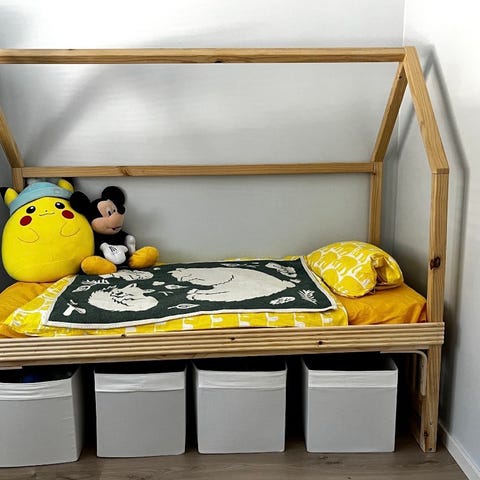 Minituden harmaa talosänky, ollut pari vuotta lapsen huoneessa, mutta siinä ei ole nukuttu kertaakaan. Lasten leikin jäljiltä muutamia pikku käytön jälkiä. Mukaan erikaeen ostettu säilytyslaatikko sängyn alle.