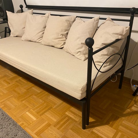 Käytetty hyväkuntoinen metallirunkoinen vuodesohva, patjan leveys 80-160 cm, rungon leveys 85 sinkkuna. Rungon pituus 210 cm. Päätyjen ja selkänojan korkeus 100 cm. Purettu osiin.